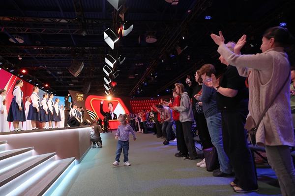 现场的俄罗斯观众被中俄青少年手拉手合唱团的精彩表演深深打动,情绪高涨,掌声经久不息。每当熟悉的旋律响起,观众们情不自禁地站起身,跟着歌声齐声合唱。《喀秋莎》《胜利节》等曲目引发了热烈的共鸣,观众们挥舞双手,用节奏鲜明的掌声为中俄青少年手拉手合唱团伴奏,“乌拉”的欢呼声此起彼伏,掌声与节拍交织,整个剧场化作一片温暖而激动的海洋。