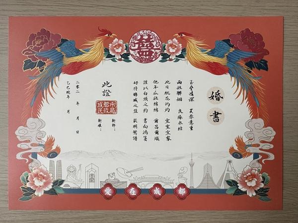 “玉垒情深,芙蓉意重,两姓联姻、良缘永结……”在四川天府新区婚姻登记处,自今年4月起,新人在领取结婚证时,会收到一份仪式感满满的“爱在成都”定制版婚书。