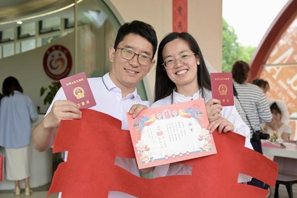 四川天府新区婚姻登记处负责人吴碧介绍,5月10日当天结婚登记30余对,远超平时周六的登记人数。