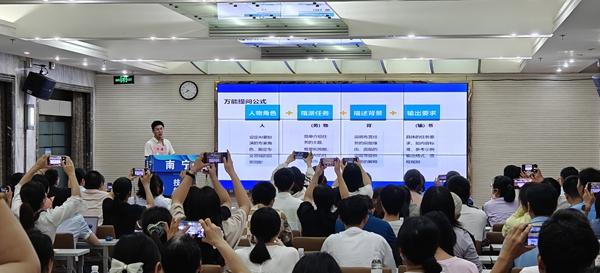 刘通是本次课堂的讲师,他是一名人工智能行业的资深人员,常常在全国各地讲授人工智能知识。这次来南宁,他将用3节课为学生讲述人工智能的知识。“3节课要讲透人工智能是远远不够的,我只能讲一些粗浅的原理,然后把大部分课时用在怎样使用人工智能工具这个学生们最需要的部分。”刘通说。