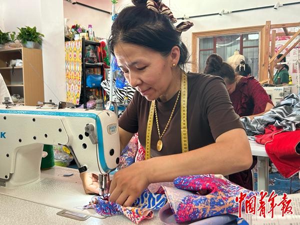 阿孜汗村村民帕力旦·铁力瓦尔地原本是一名家庭主妇,2021年,她发挥自己在裁缝手艺上的特长,将自家院落改造成了一个裁缝店,利用维吾尔族的特色绸缎——艾德莱斯绸来制作服装并销售,年收入5万元到6万元。