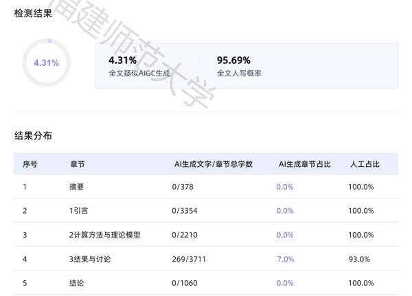 检测结果显示1.3%。“这也太低了!”王菁担心因AI检测率过低,论文会被抽去“盲审”。实际上,她撰写毕业论文的全程都用到了AI工具,包括内容生成、润色。