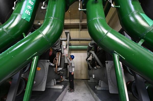 7月中旬,北京市昌平区一片正在装修中的医学企业园区里,供能机组藏在地下车库里一处封闭空间。这是一个冷热同供的项目,还未正式运行。中青报·中青网记者了解到,市政供暖时,暖水管道里水温大约60℃;供冷项目中,管道里流淌7℃左右的“冷冻水”。冷冻水要通过风机盘管扩散,送出冷风。