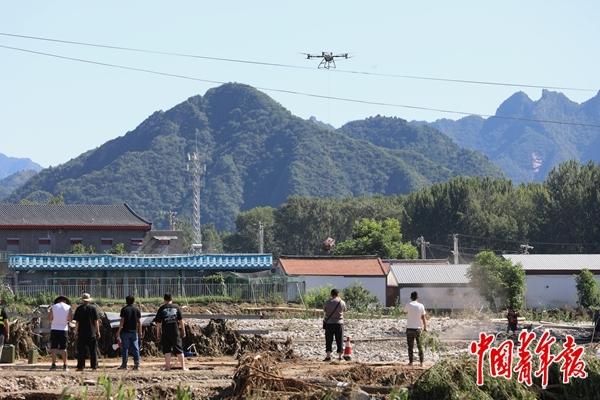 7月30日,北京市密云区北庄镇,志愿者通过无人机向东庄村空投发电机。因近日暴雨引发的山洪,东庄村与外部连接的桥梁被冲垮。据执行该项任务的志愿者团队负责人介绍,无人机每次可投送100公斤左右的物品。中青报·中青网记者 陈剑/摄