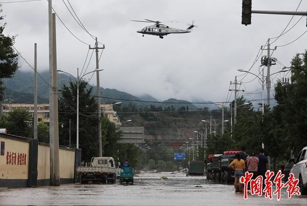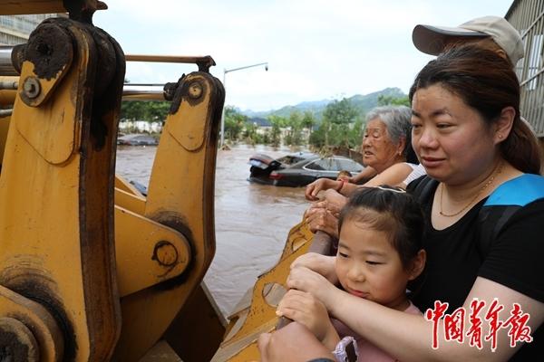 同样是在密云区,太师屯镇中心街上罕见地驶进多辆救援车辆、挖掘机、救援艇,目的地是太师屯镇养老照料中心和周围被水困住的居民区,救援人员要和涨起来的洪水抢时间,转运更多的被困群众。