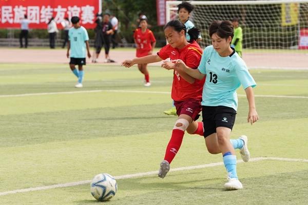 8月5日,新疆代表队选手与贵州代表队选手在比赛中。当日,“石榴花开 青春绽放”全国青少年女子足球民族团结友谊赛在新疆喀什开赛。此次比赛为期5天,共吸引来自全国21支代表队的300余名12岁至14岁女学生参赛。新华社记者 阿曼/摄