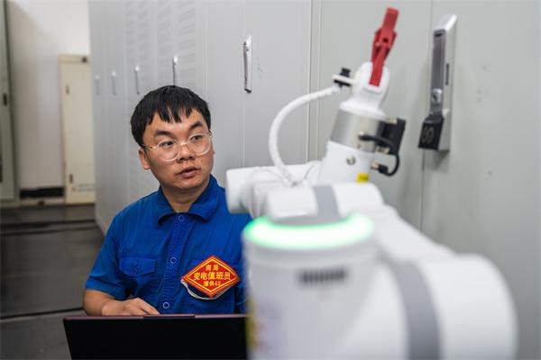 夜深之时,位于赣闽交界处昌福铁路线旁的南丰牵引变电所内一片寂静,只有变压器低沉的嗡鸣与山风拂过树梢的声音相伴。所内高压室里灯火通明,中国铁路南昌局集团有限公司鹰潭供电段南丰牵引变电所的变电值班员汤学平,正俯身调试一台白色机器人的机械臂。