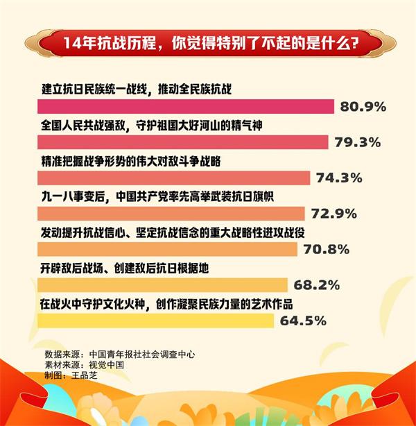 今年是中国人民抗日战争暨世界反法西斯战争胜利80周年,各地文博场馆纷纷推出特色主题展览和活动。一幅幅珍贵的历史图片,一件件真实的文物史料,让人们对那段决定中国人命运的历史过目难忘。回望14年抗战历程,你觉得特别了不起的是什么?近日,中国青年报社社会调查中心通过共青团中央微信公众号、中国青年报社全媒体矩阵进行的一项有10306名受访者参与的调查显示,80.9%的受访者认为建立抗日民族统一战线,推动全民族抗战最了不起。