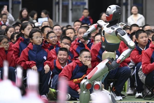 10月13日,新疆生产建设兵团第一中学学生在科技节开幕式上观看智能机器人跳舞。