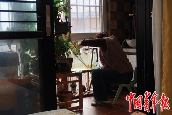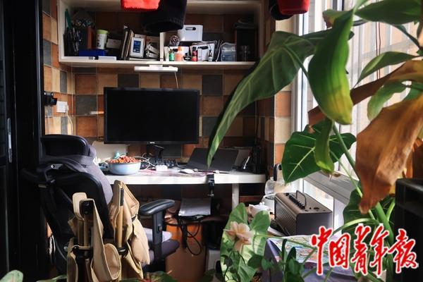 洗衣机对面,是高俊的显示屏和导演椅。这个90平米的两居室空间有限,高俊就在阳台上给自己布置了一块办公区,装上遮阳帘,用绿植和鱼缸隔开。