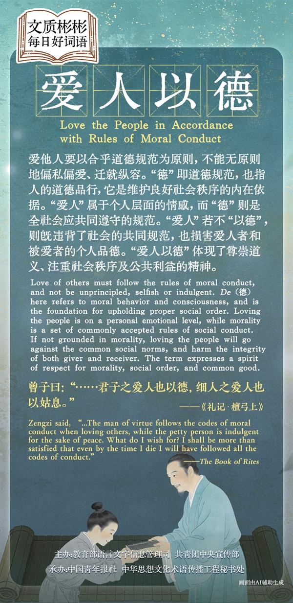 爱护和帮助他人要以合乎道德规范为原则,不能无原则地偏私偏爱、迁就纵容。“德”即道德规范,也指人的道德品行,它是维护良好社会秩序的内在依据。“爱人”属于个人层面的情感,而“德”则是全社会应共同遵守的规范。“爱人”若不“以德”,则既违背了社会的共同规范,也损害爱人者和被爱者的个人品德。“爱人以德”体现了尊崇道义、注重社会秩序及公共利益的精神。