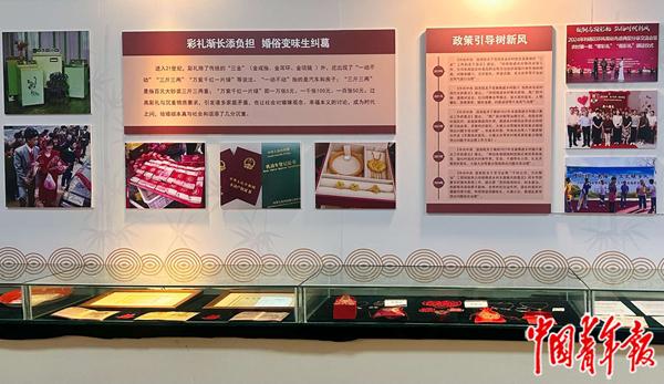 当地群众对婚嫁彩礼的认知转变,并非一蹴而就。日前,中青报·中青网记者走进利通区牛家坊村民俗文化馆,一组图片与实物展示清晰记录了当地彩礼习俗的变迁:新中国成立初期,彩礼是几袋小麦、大豆;改革开放后,变成“36条腿儿”(组合家具)、“三转一响”(自行车、缝纫机等);到了2012年,流行起“一动不动”(汽车、房子)、“万紫千红一片绿”(特定金额现金组合)。高额彩礼曾给不少家庭带来沉重负担。文化馆展示图数据显示,2008年-2010年,牛家坊村50对新婚夫妇中,有7对因高额彩礼间接引发家庭矛盾而离婚。