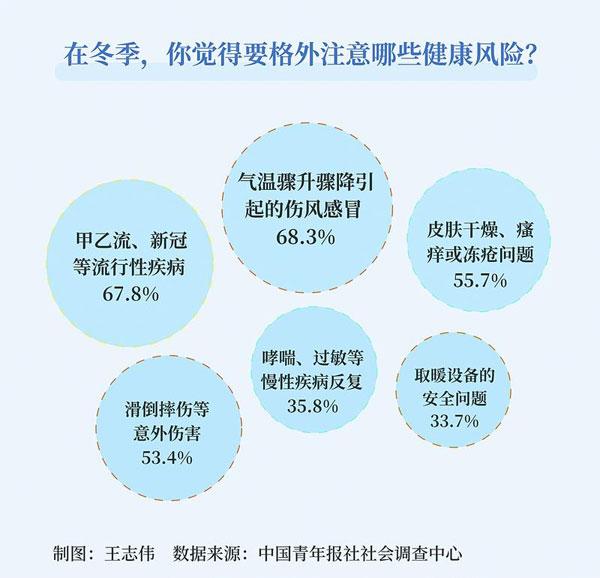 伤风感冒和流感等流行性疾病是受访者冬季最重视的健康风险