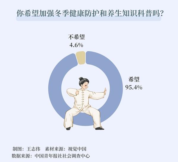 在社交平台搜索冬季养生食谱,与朋友相互推荐养生好物……健康过冬,大家期待获取哪些健康防护和养生知识?日前,中国青年报社社会调查中心联合问卷网(wenjuan.com)发布的一项有1001名受访者参与的调查显示,95.4%的受访者希望加强冬季健康防护和养生知识科普,其中43.8%的受访者非常希望。进一步分析发现,00后受访者希望加强科普的比例更高,为97.7%。