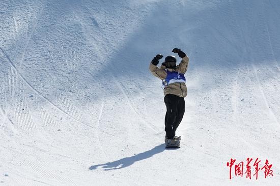 2月23日,内蒙古呼伦贝尔扎兰屯市,在“十四冬”单板滑雪大跳台男子公开组决赛中,山西队选手苏翊鸣完成第三跳后举手庆祝。