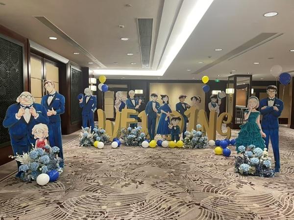 王韵瑶与丈夫因《名侦探柯南》(以下简称“名侦”)结缘,从婚礼迎宾区的名侦30周年海报图,到主舞台上主角告白、亲吻的著名场景,从指引牌,到喜糖盒子,王韵瑶的婚礼现场处处透着名侦元素。在他们的陪伴下,王韵瑶携手佩戴着芙莎绘(名侦角色)胸针的爱人,走进人生下一个阶段。