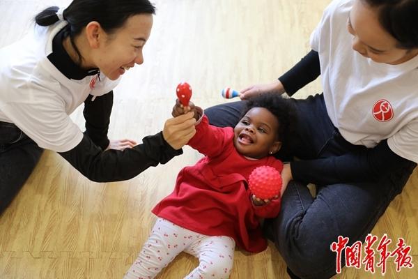 12月6日,北京市朝阳区托育综合服务中心,乳儿班的托育老师邢雪(左一)和来自乌干达的1岁多的玛利亚(音译)互动玩耍。