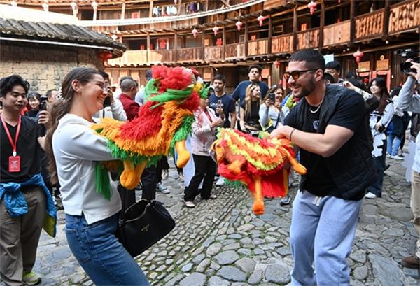 12月11日,外国青年学生在土楼里体验掌中木偶戏。当日,参加“2024年世界青年看福建”的外国青年学生代表走进福建省漳州市南靖县,领略土楼魅力,感受当地风土人情。王东明/视觉中国