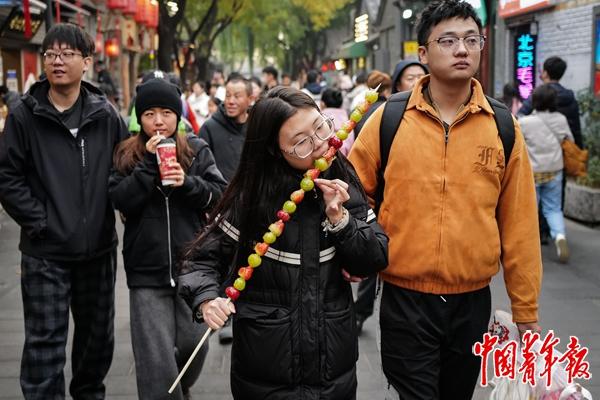 在全国各大商业街,一米长的冰糖葫芦迅速成了明星产品,被年轻消费者称为“拍照道具、路人注意力的诱捕器、爱情的可视化宣言”。一些年轻人觉得,吃并不是最重要的,只要拥有心情就会很好。