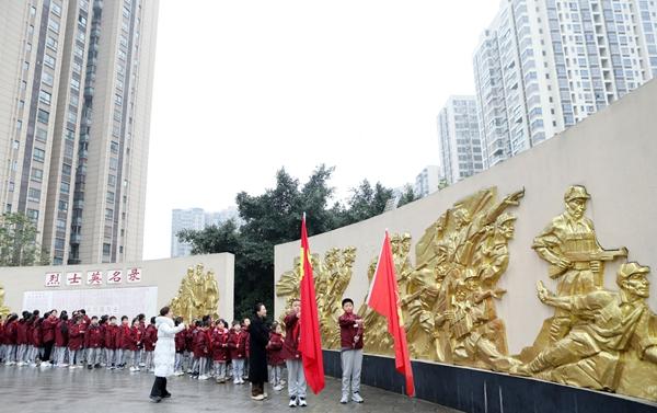 12月12日,重庆市永川区红旗小学党总支在桂山公园革命烈士纪念碑前,开展“铭记历史,勿忘国耻,振兴中华”国家公祭日主题思政教育活动。图为师生们瞻仰革命英雄人物群雕像。视觉中国供图
