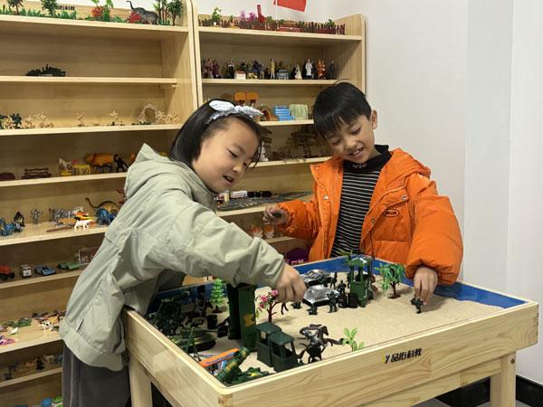 在浙江省江山市贺村镇中心社区“心灵加油站”,小朋友们在玩沙盘游戏。 为进一步加强对未成年人成长的关心关爱,中心社区在党群服务中心内打造了涵盖心理咨询、情绪宣泄、游戏娱乐等功能的“心灵加油站”,配置有益智玩具、心理沙盘、智能宣泄仪、情景交互系统等现代化设备,并定期推出寓教于乐的心理健康趣味活动。柴静/摄