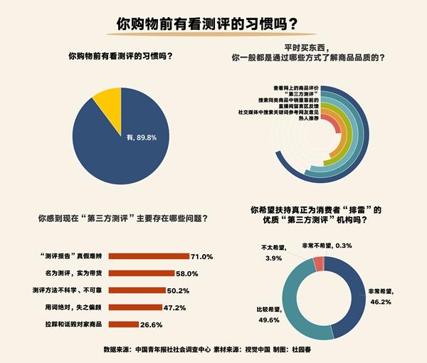 日前,中国青年报社社会调查中心联合问卷网(wenjuan.com),对1338名受访者进行的一项调查显示,89.8%的受访者购物前有看测评的习惯,但71.0%的受访者感慨“第三方测评”提供的“测评报告”真假难辨,95.8%的受访者希望国家扶持真正为消费者“排雷”的优质“第三方测评”机构。