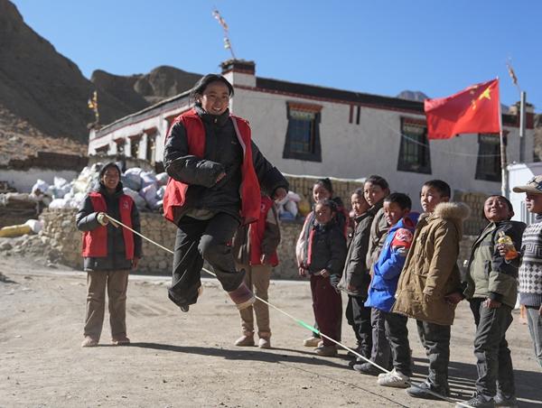 1月25日,大学生志愿者在定日县热木青村安置点和孩子们一起跳绳。这些天来,在西藏日喀则市定日县热木青村,6名定日籍大学生在集中安置点辅导小朋友们做寒假作业,带他们一起玩游戏。