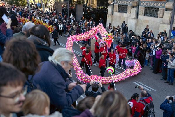 1月25日,在西班牙巴塞罗那,演员在“与巴塞罗那共庆新春佳节”活动上表演舞龙。当日,“与巴塞罗那共庆新春佳节”活动在巴塞罗那市中心举行,吸引了众多当地居民参与。胡安·戈萨/摄(新华社发)