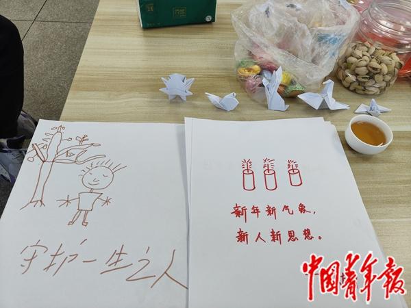 一些还不能出院的患者,神志清醒时会萌生回家的念头,医护人员给他们分发过年的零食糖果,聊天谈心鼓励他们。医生们给记者展示了住院患者用纸折的兔子、千纸鹤、宝塔,还有他们写的字、画的画。很多折纸上写着他们的愿望:“新年新气象”“早日出院”。