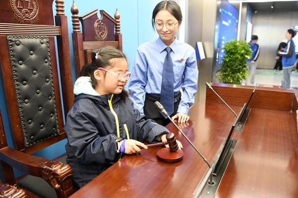 4月2日,江苏省扬州市邗江区人民检察院青少年法治教育基地,视障儿童在体验“模拟法庭”。据介绍,该基地由中国聋协、中国盲协等单位指导,当地人民检察院打造,系全国首个无障碍青少年法治教育基地。教育基地的每个板块兼顾各类人群观展体验,配备盲道、同声传译、盲文翻译、无障碍电影、黑暗体验等无障碍普法设施,实现视障、听障、残障等未成年人特殊群体法治教育全覆盖,真正做到法治教育“无障碍”。牛宏超/摄
