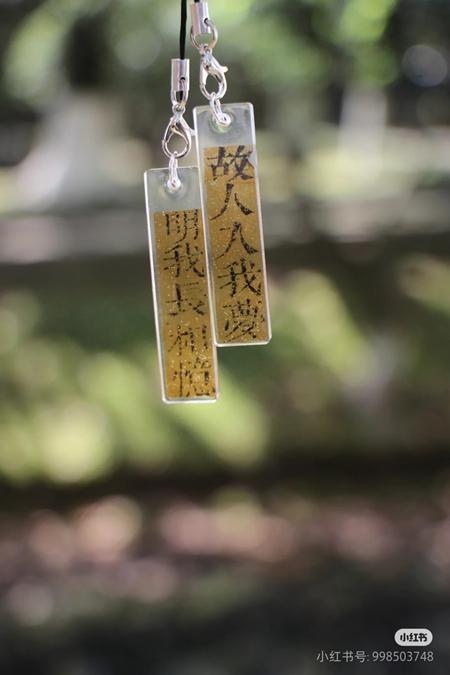 “酒还是最应景的。”姜明自己带过一款叫“李白”的清酒、两小罐家乡米酒,还有自己设计、亲手制作的古籍滴胶材质小挂件——写着杜甫对李白表达思念的诗句“故人入我梦,明我长相忆”。
