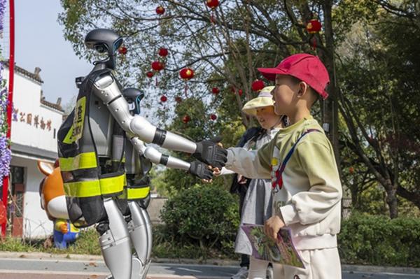 4月5日,安徽芜湖,在繁昌区孙村镇境内的马仁奇峰景区,游客与智能人形机器人互动。