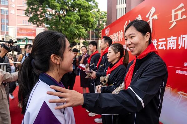 4月8日,李晓霞(前右)与云南师范大学实验中学学生交流。当日,“国球奥运冠军进校园”活动在云南师范大学举行。马龙、许昕、刘诗雯、李晓霞把国球精神带进校园,而西南联大教育救国的历史也为冠军们上了一堂爱国课。 新华社记者 胡超/摄