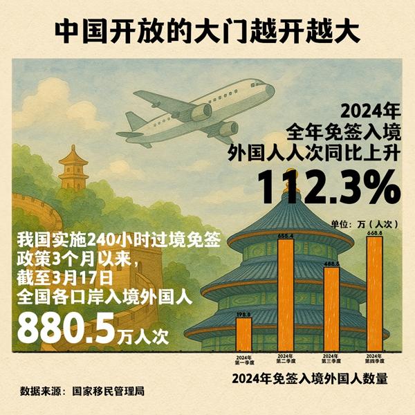 更大范围、更宽领域、更深层次的政策红利持续激活中国入境旅游市场,“China Travel(中国游)”吸引力进一步提升。截至3月17日,全国各口岸入境外国人880.5万人次,同比增长34.9%。“中国入境旅游市场正快速增长。”世界旅游城市联合会特聘专家、中国社会科学院旅游研究中心特约研究员王笑宇预测,“未来两三年,中国入境旅游市场将比较火爆。”