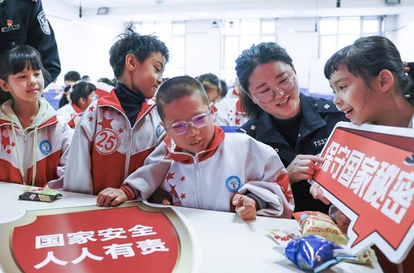 4月10日,乌鲁木齐市公安局天山区分局新民路派出所辅警杨金梅在为乌鲁木齐市第30小学学生讲解国家安全相关法律法规知识。第十个全民国家安全教育日即将到来之际,乌鲁木齐市公安局民警走进校园开展国家安全教育主题活动。新华社记者 王菲/摄