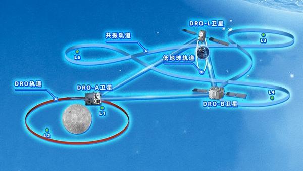 2017年,中国科学院空间应用工程与技术中心科研团队,率先启动地月空间DRO的独特属性和战略价值预先研究及关键技术攻关;2022年2月,中国科学院启动实施A类战略性先导专项“地月空间DRO探索研究”,提出自主创新地月空间大尺度三星星座方案;2024年2月3日,首颗卫星DRO-L,成功进入太阳同步轨道,并正常开展相关实验;2024年3月13日,DRO-A/B双星组合体在西昌卫星发射中心升空,在发射异常情况下,工程团队成功紧急实施了多次近地点轨道机动补救控制,组合体在历经约850万公里航程后,最终准确进入预定DRO轨道。2024年8月28日,DRO-A/B双星组合体在DRO成功分离。8月30日,DRO-A、DRO-B和DRO-L卫星成功构建K频段微波星间测量通信链路,首次验证了地月空间尺度三星互联互通的组网通信。2025年3月底,DRO-B卫星离开DRO,三颗卫星进一步建成更大空间尺度的“地月灯塔”。