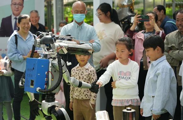 4月20日,在第二十六届中国(寿光)国际蔬菜科技博览会上,人们在观看农业机器人展示。