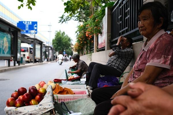 山上收杏子的价格是一斤2.3元,徐继美们为了多卖2元钱,情愿一趟趟背下山。卖杏是个技术活,公交站点、菜市场、立交桥下都是好地方。车子经过领秀城,这是济南规模最大的社区之一,他们挑着担子进去,一小时杏子就能卖完。76岁的曹文坤,经常一个人拖着一辆板车、两篮子杏,坐着公交上城里卖。