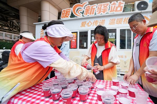 6月25日,在北京市东城区崇外街道一处“暖新驿站”外,街道工作人员在为外卖员、快递员准备冰镇饮料。连日来,北京持续高温。在北京市东城区崇外街道,专为新就业群体和户外工作者设置的“暖新驿站”,成为外卖员、快递员和户外工作者高温天里的清凉补给站。新华社记者 鞠焕宗/摄