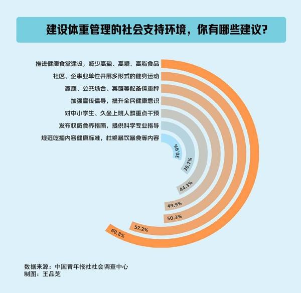 建设体重管理的社会支持环境,60.8%的受访者期待推进健康食堂建设,减少高盐、高糖、高脂食品,57.2%的受访者希望社区、企事业单位开展多形式的健身运动,50.3%的受访者建议家庭、公共场合、宾馆等配备体重秤。