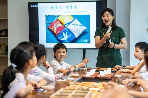 6月28日,在长沙图书馆湘江新区周家湾分馆,志愿者指导小朋友制作香囊。当日,长沙图书馆湘江新区周家湾分馆正式开放,为多样化的文化活动和邻里互动提供场所,丰富了当地群众的文化生活。该馆共上下两层,一楼设有综合借阅区、休闲阅读区,二楼设有展览空间、活动空间等功能配套区域,总面积约1400平方米,规划藏书2.5万册,是目前长沙地区规模最大且功能最齐全的社区图书馆。新华社记者 陈思汗/摄