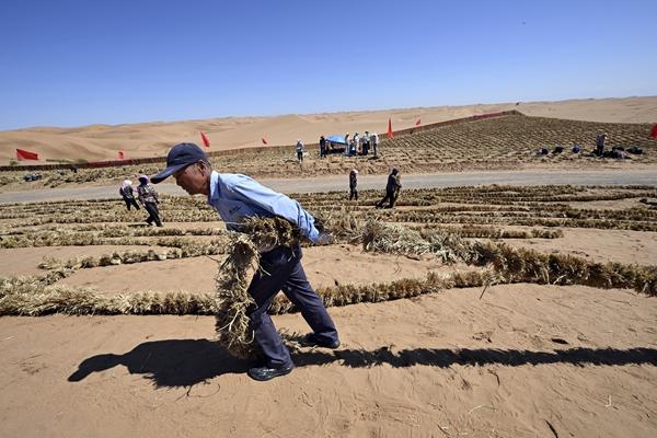 6月30日,治沙工人在位于宁夏中卫市长流水村的腾格里沙漠东南缘扎草方格。