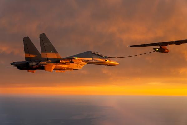 日落时分,大地已被黛青色夜幕笼罩。高空的战机在夕阳照耀下仿佛身披金色战甲,他们正在第二次空中加油,随后再次前出,持续担负区域封控任务。