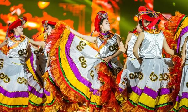 演员在六盘水市水城区海坪彝族火把节活动上表演歌舞《七月火把节》(7月18日摄)。