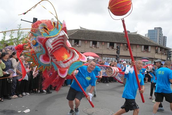 7月22日,台州民众在“送大暑船”的游行队列中进行舞龙表演。 当日是大暑节气,浙江省台州市沿海群众在椒江区葭沚街道参加传统的“送大暑船”仪式。“送大暑船”2021年被列入第五批国家级非物质文化遗产代表性项目名录。新华社记者 翁忻旸/摄