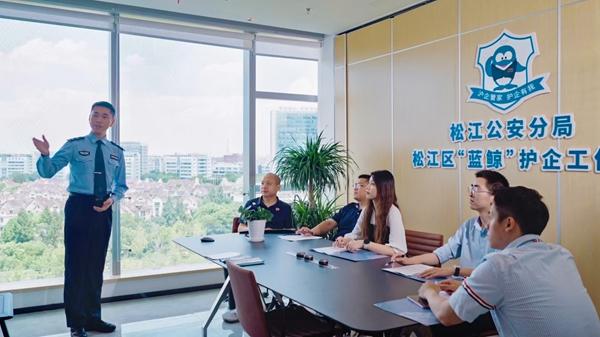 松江分局经侦支队支队长蒋永欢介绍,2024年7月,松江公安选址位于松江区新桥镇千帆路的长三角G60科创云廊8号楼7层,挂牌成立松江区“蓝鲸”护企工作站,并与检、法、司融合办公,是目前上海市面积最大、功能最全、辐射最广的“蓝鲸”护企工作站。