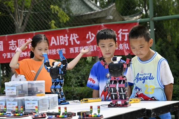 7月23日,小朋友在活动现场观看机器人表演。当日,中央宣传部和宁夏回族自治区党委、政府联合主办的2025年全国文化科技卫生“三下乡”集中示范活动在宁夏青铜峡市举行。当天,来自宣传、文化、科技等方面的专家和志愿者,在青铜峡市峡口镇综合文化站广场,为当地农民群众提供了政策宣讲、文艺演出等服务。新华社记者 王鹏/摄