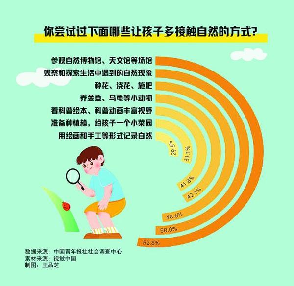 为了亲近自然,很多家长喜欢带孩子去户外。日常生活中,有哪些方式可以让孩子多接触自然?近日,中国青年报社社会调查中心联合问卷网(wenjuan.com),对1336名未成年人的家长进行的一项调查显示,日常生活中,52.8%的受访家长会带孩子参观自然博物馆、天文馆等场馆,50.0%的受访家长会带孩子观察和探索生活中遇到的自然现象,48.6%的受访家长会带孩子种花、浇花、施肥,42.1%的受访家长会带孩子养金鱼、乌龟等小动物,41.8%的受访家长会带孩子看科普绘本、科普动画丰富视野。