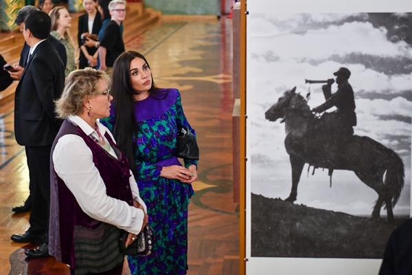 7月24日,在中国驻俄罗斯大使馆,嘉宾参观“铭记历史 开创未来”——纪念中国人民抗日战争暨世界反法西斯战争胜利80周年图片展。照片生动回顾中国人民英勇抗击日本侵略者历史,介绍苏联航空志愿队与中国人民共同抗战的事迹,彰显中俄两国人民在世界反法西斯战争期间结下的战斗情谊。 新华社记者 曹阳/摄