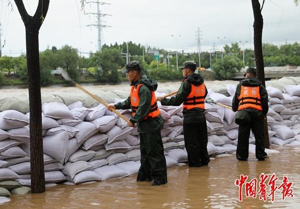 7月29日,北京密云宁村新桥附近的潮河岸边,参与抢险的武警战士正在拍实和加固堤坝上的沙袋,应对近期因暴雨引发的洪峰。中青报·中青网记者 陈剑/摄